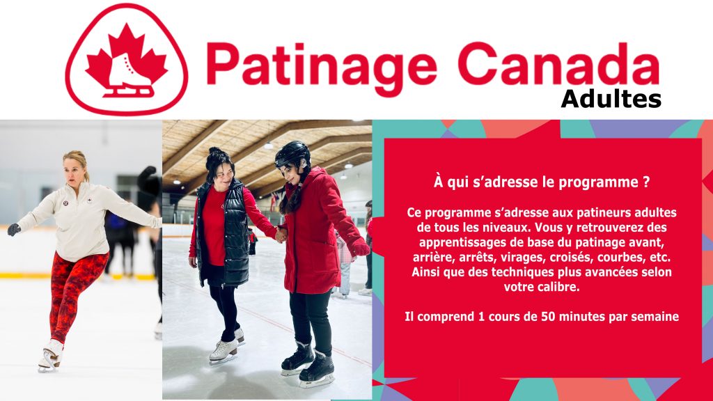 Que le patinage soit nouveau pour vous ou que vous l’ayez pratiqué toute votre vie, Patinage Canada accueille les athlètes de tous les âges dans ses programmes. Nos clubs et écoles de patinage, présents partout au pays, offrent des formations adaptées aux adultes pour vous aider à apprendre le sport, à l’apprécier et à y participer, quel que soit votre âge ou votre niveau d’habileté.