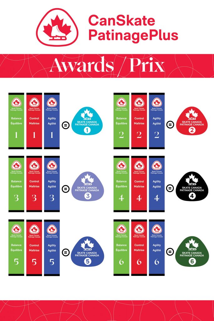 Au fur et à mesure que le patineur acquière ses différentes habileté il recevra des rubans. Dans chaque étapes ont y retrouve 3 niveaux comme illustré ci-bas.