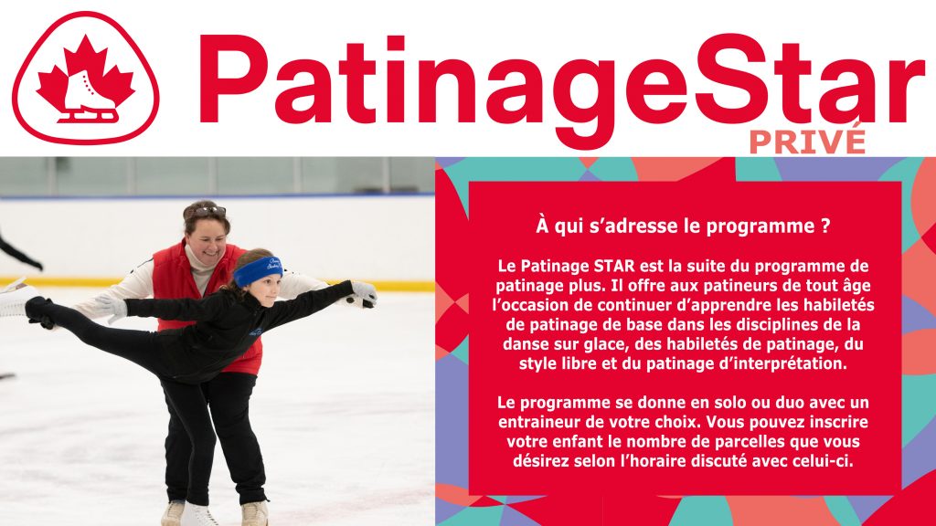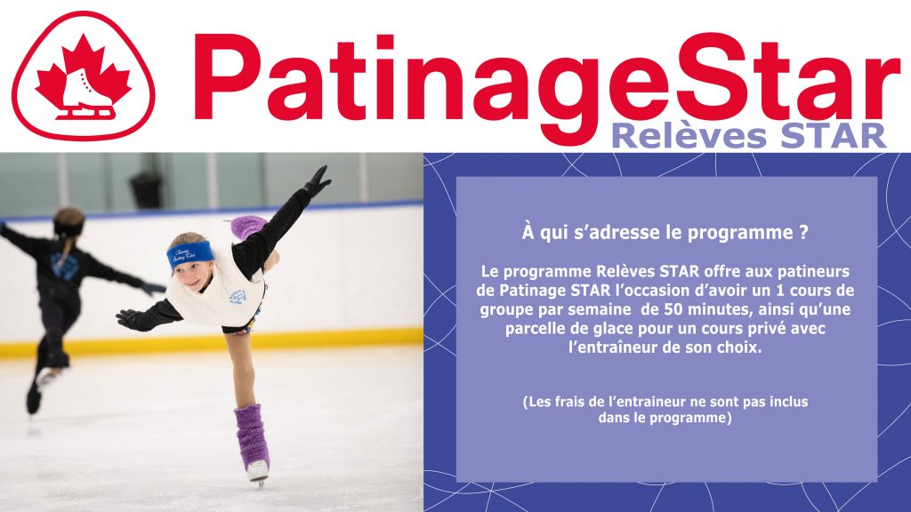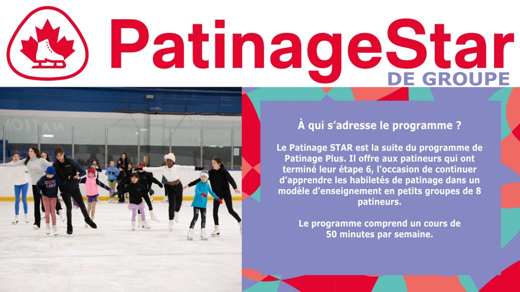 Patinage STAR offre aux patineurs de tout âge l’occasion d’apprendre les habiletés de patinage de base dans les disciplines de la danse sur glace, des habiletés de patinage, du style libre et du patinage d’interprétation. Unique au Canada, ce programme enseigne les habiletés de patinage artistique en leçons en groupe ou particulières, de manière progressive et logique, et offre des prix et des récompenses conçus spécialement pour ce groupe de patineurs. Ces derniers ont la possibilité de subir les tests de Patinage Canada par l’intermédiaire d’un système de tests national uniformisés. Les patineurs qui ont maîtrisé les habiletés de patinage artistique peuvent aussi choisir de poursuivre le patinage artistique ou le patinage en couple.